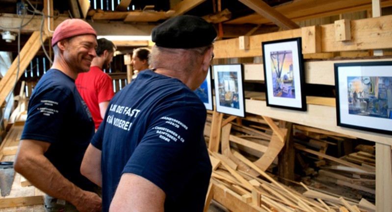 Inspirasjonen går for noen lenger enn bare det å bygge en fin båt. Leif har gjennom vinteren også malt bilder fra/av båtbyggere og båthus. Han har solgt flere av bildene. Det kan jo være hyggelig å ha et maleri av seg selv når du holdt på å få bordgangen til å passe.